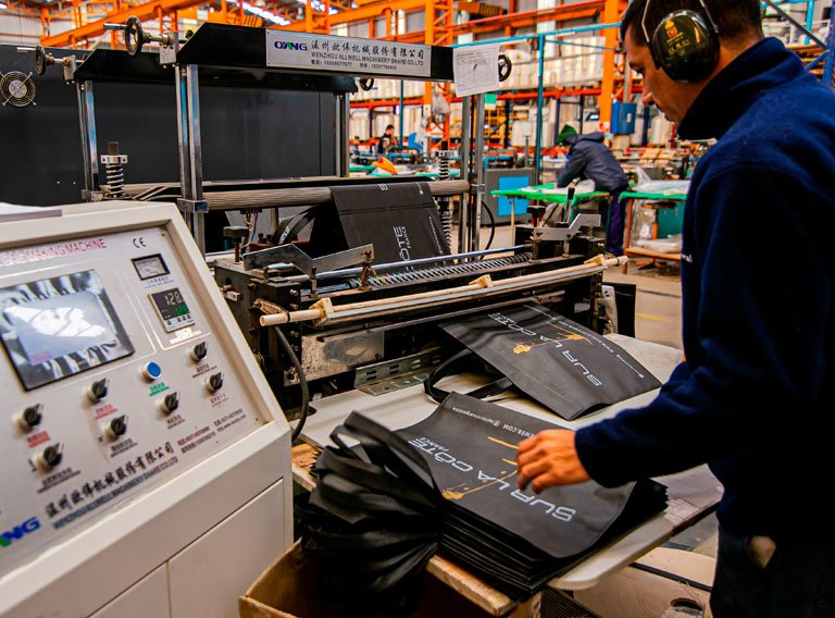 En este proceso, las bobinas se colocan en la confeccionadora, la misma arrastra el film el cuál es orientado a pasar por los cabezales de corte y sellado por calor.