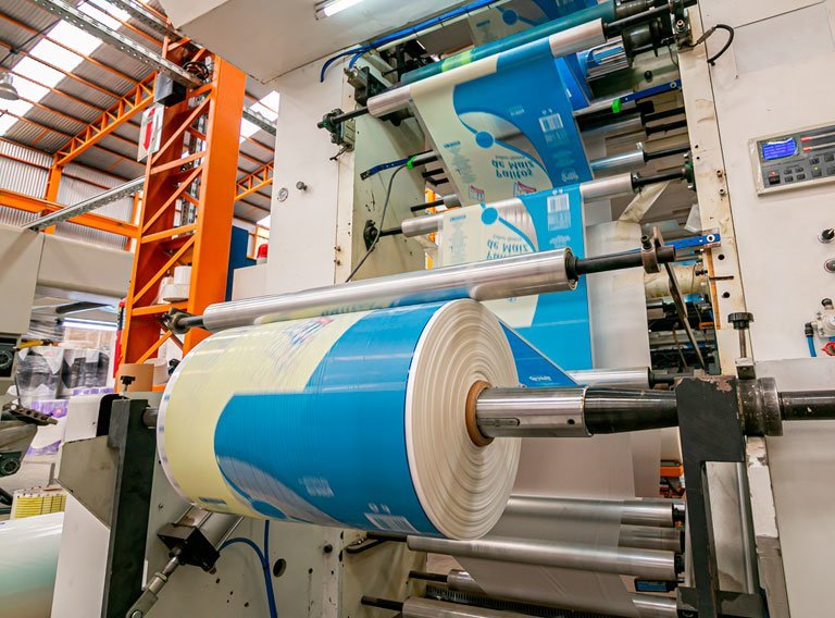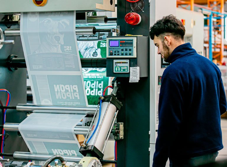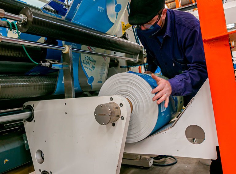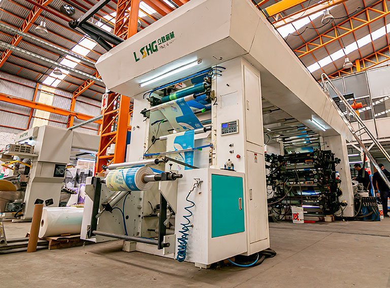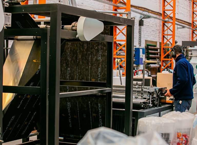 Luego en caso que se requiera un film o una bolsa impresa, el siguiente proceso es la IMPRESIÓN FLEXOGRÁFICA. Las especificaciones del logo a imprimir se hacen especialmente para cada cliente.